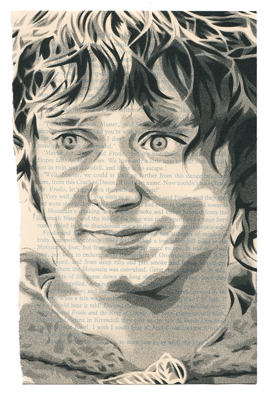 5.5x8.25" 4 layer stencil and spray paint on a page from The Return of the King, by J.R.R. Tolkien.